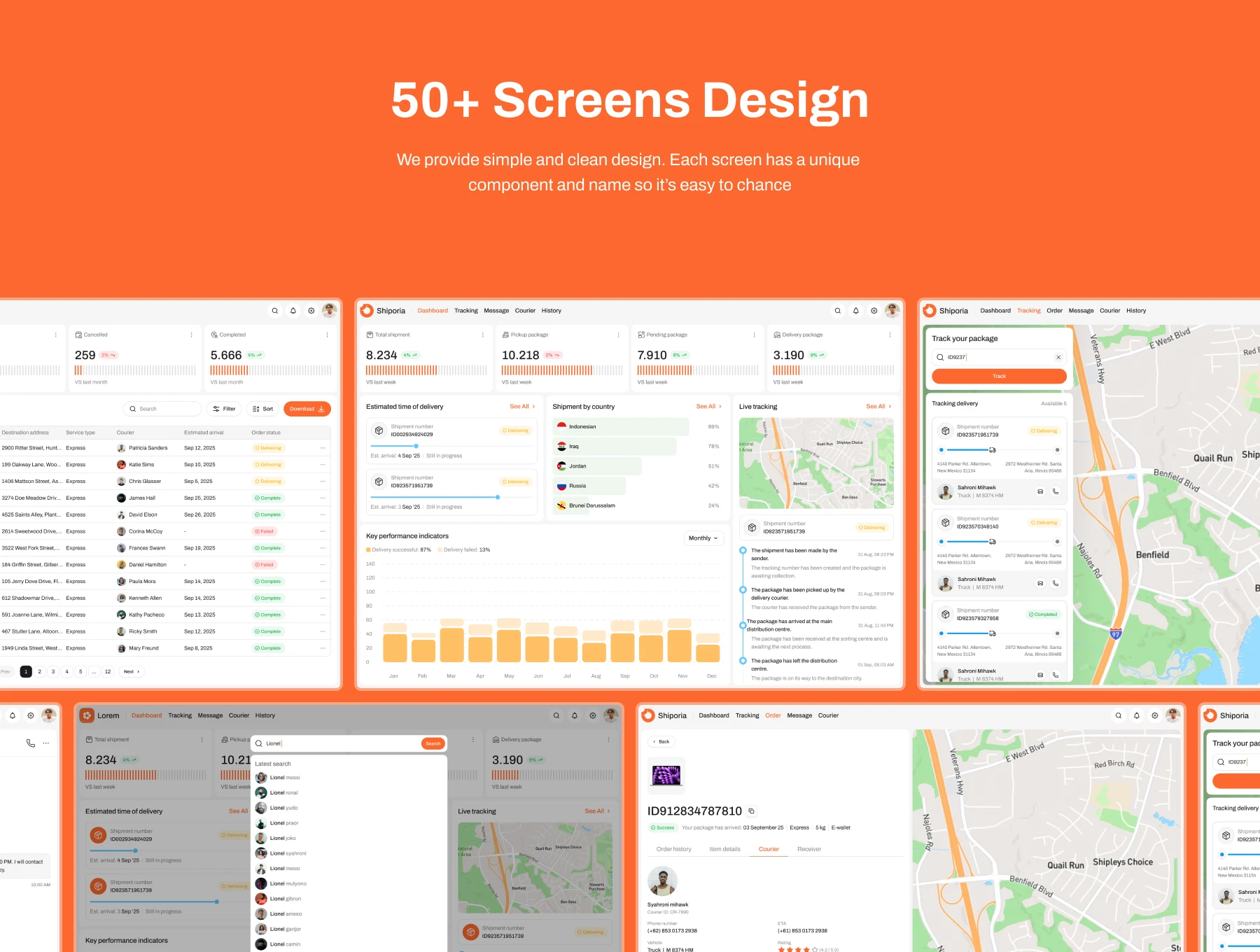 100+ Screens – Dashboards, tracking, courier management, live maps, analytics, notifications, and more.