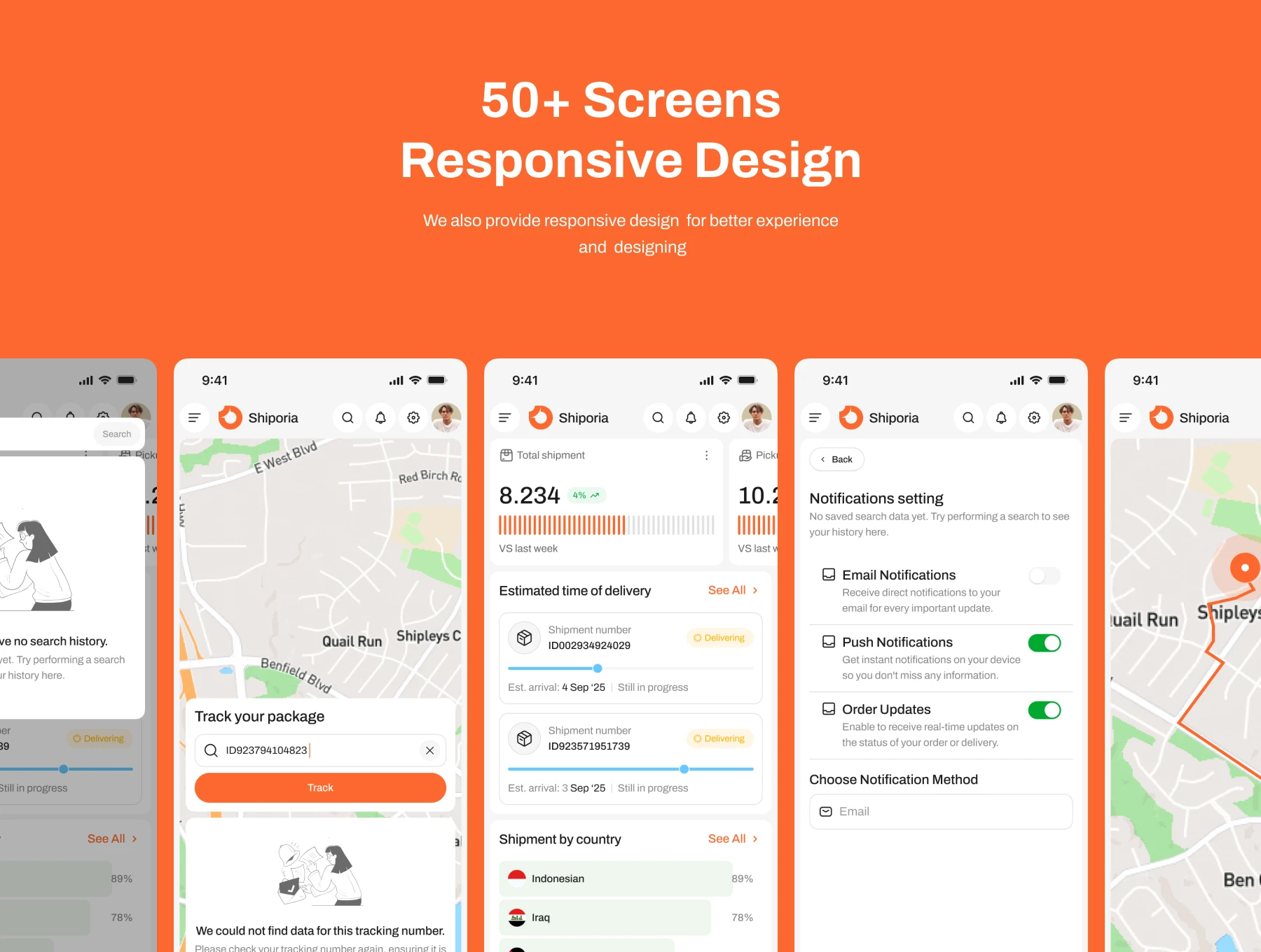Unlike standard UI kits, Shiporia emphasizes live tracking, maps, and delivery flows — the core of any logistics product.